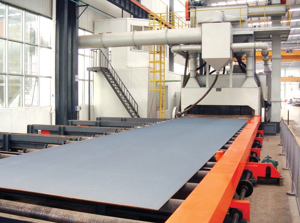 Q69輥道通過式拋丸機系列鋼板,型材拋丸機(臥式)該系列拋丸機型號有Q6910、Q6915、Q6920、Q6925、Q6930、Q6935、Q6940、Q6945等;輥道通過式拋丸機以貫穿清理室的機動輥道為工件的運載裝置,工件在前進的同時接受多角度的拋射清理,采用連續通過式作業方式;該設備和預熱、噴漆、烘干等工序組成流水線,廣泛應用于船舶、汽車、機車車輛、橋梁、鋼結構、機械等行業的鋼板、型材及結構件的預處理工藝;處理鋼板厚度1.5~100mm,寬度1000~4800mm;清理型材高度300~800mm;輥道輸送速度(無級調速)0.5~6m/min;采用常規控制或PLC控制。