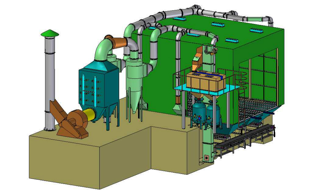 噴砂房的特點是采用蜂窩式吸砂地板技術,采用氣力輸送原理,利用空氣動力將砂料回收,再通過管道吸送到砂塵分選器中進行自動砂塵分選,分選出來的有用砂料自動落入噴砂壓力罐,進入循環(huán)使用;分選出來的破碎砂料、漆皮、氧化皮、粉塵等無用雜物則自動進入集塵器進行過濾除塵.